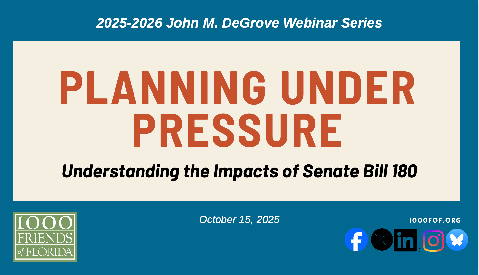 Senate Bill 180, passed in 2025 under the banner of hurricane recovery, upended local planning authority across Florida by freezing comprehensive plan updates, limiting resilience measures, and inviting legal uncertainty for cities and counties. 1000 Friends of Florida hosted an in-depth discussion on the law’s implications for local governments, citizens, and Florida’s growth management framework. Featured speakers — attorney Richard Grosso, land use attorney and 1000 Friends Board Chair Susan Trevarthen, and Deltona City Commissioner Dori Howington — explored SB 180’s legal foundations, constitutional concerns, and real-world impacts, along with emerging strategies to protect community planning and restore local control.