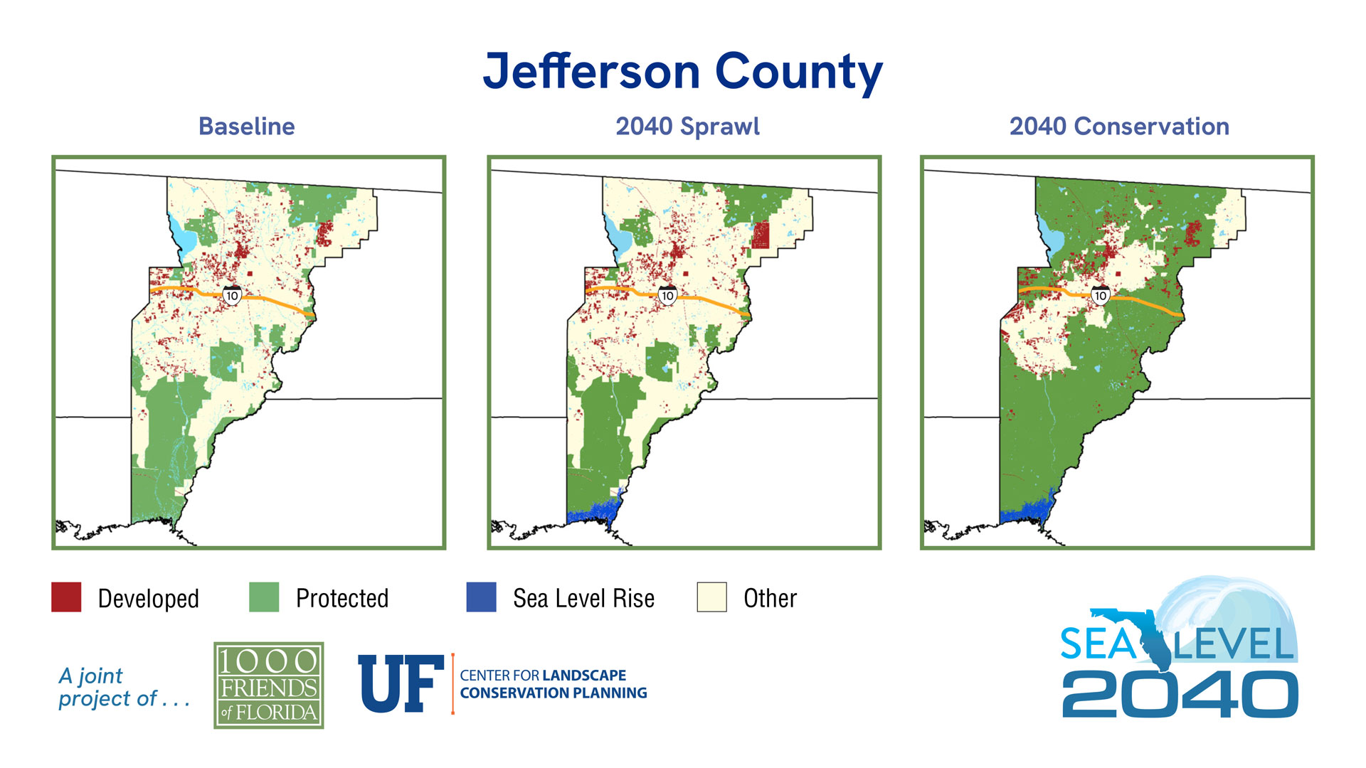 | 2019 | % of Total Acreage | Sprawl 2040 | % of Total Acreage | Conservation 2040 | % of Total Acreage | |