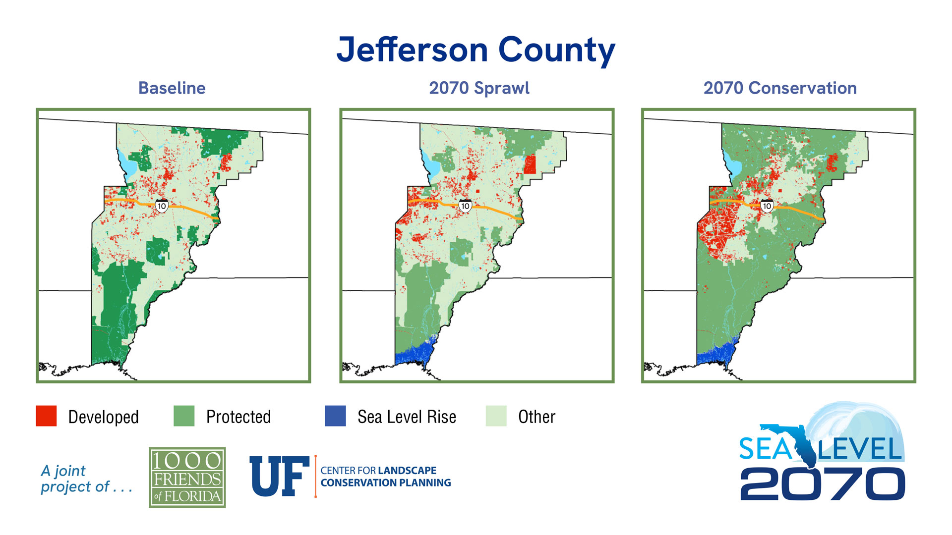 | 2019 | % of Total Acreage | Sprawl 2070 | % of Total Acreage | Conservation 2070 | % of Total Acreage | |