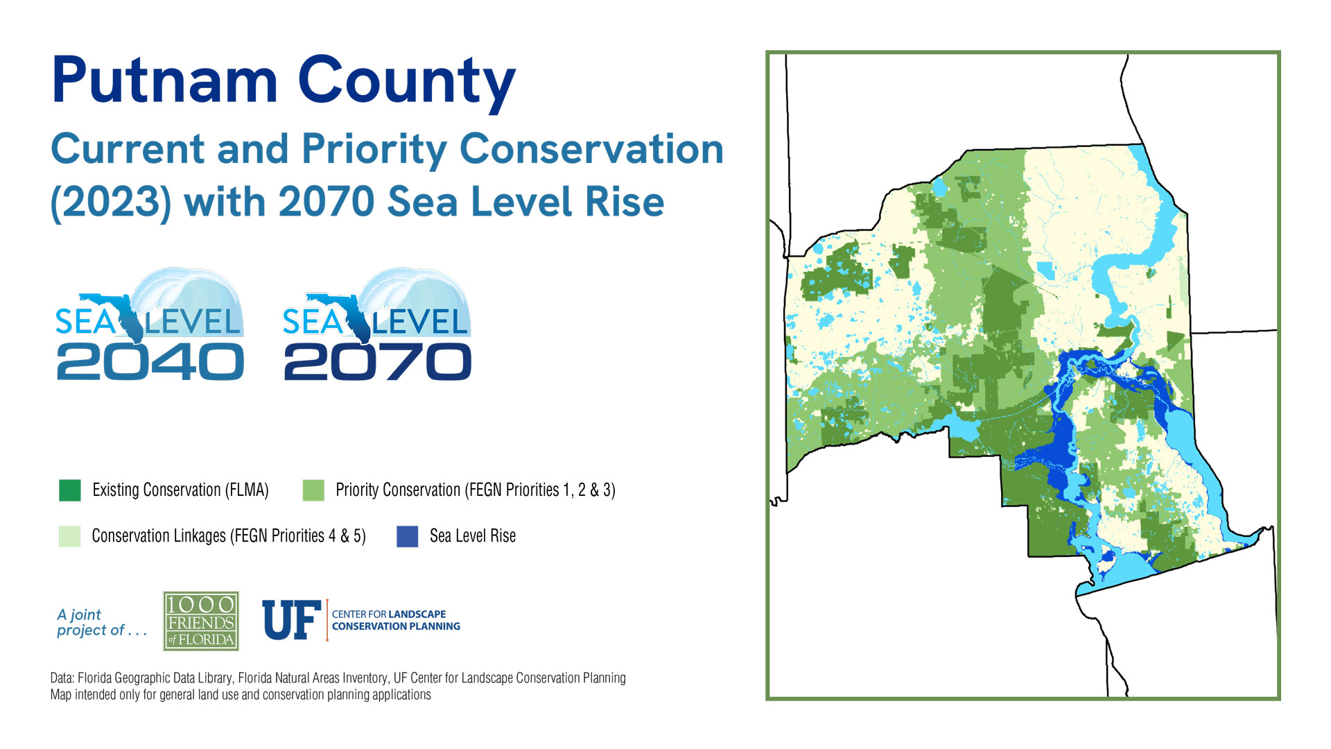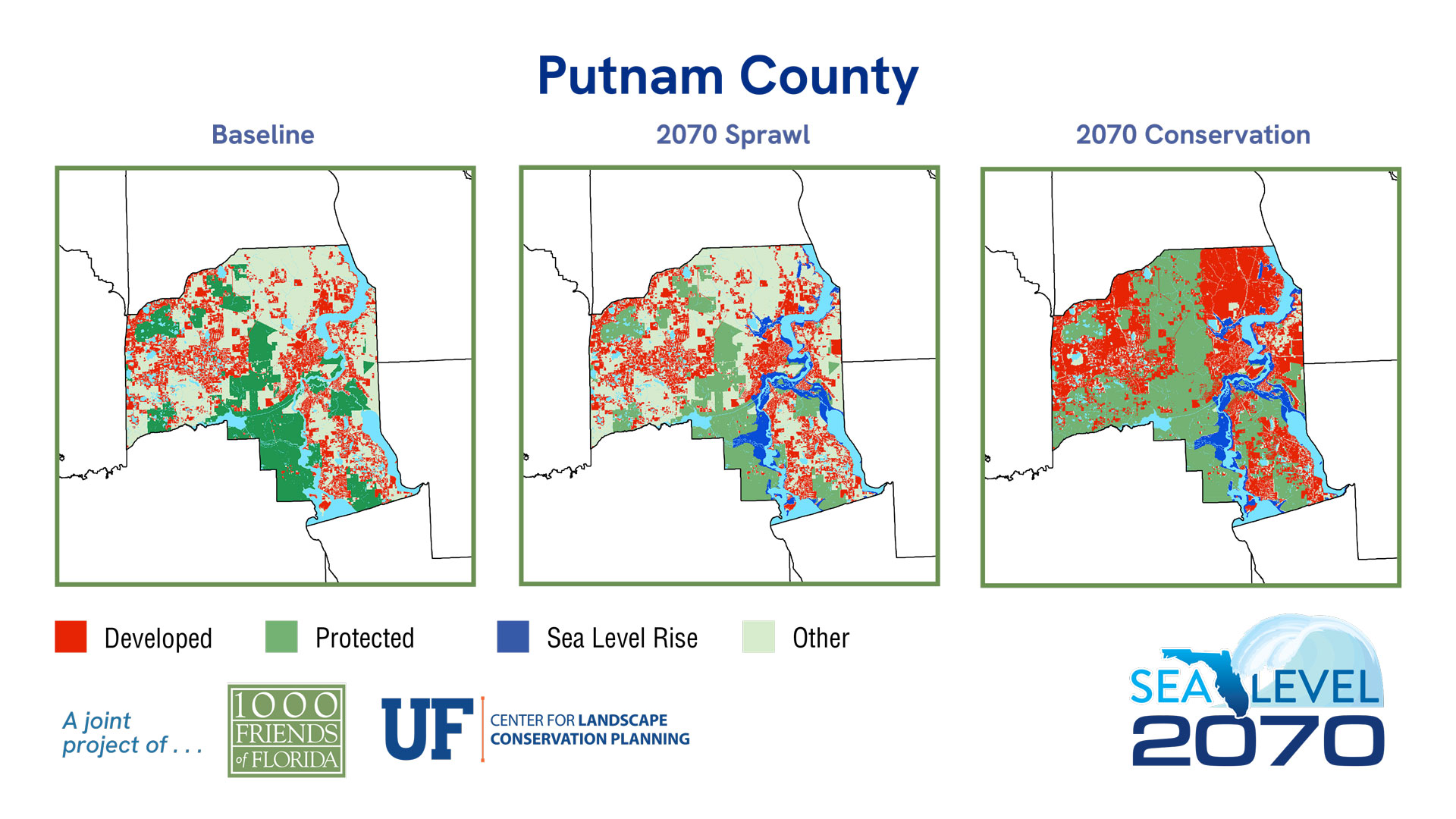 NOTE: The Sea Level 2070 data shown below is based on 2015 Bureau of Economic and Business Research (BEBR) moderate population growth projections to make it consistent with the earlier 2016 Florida 2070/Water 2070 study, while the Sea Level 2040 data shown above is based on BEBR’s 2021 moderate population growth projection. There are two primary reasons for any discrepancies between these projections. First, BEBR projected a higher rate of growth in 2015 and adjusted the rate of growth downward for 2070 in its 2021 projections. In some cases when using the 2015 projections for 2070, these adjustments resulted in somewhat lower population growth projections for specific counties when compared to the 2040 projections using more recent data. Second, actual population growth that occurred between 2015 and 2021 is subtracted from the 2070 projections, making the 2070 figures lower.