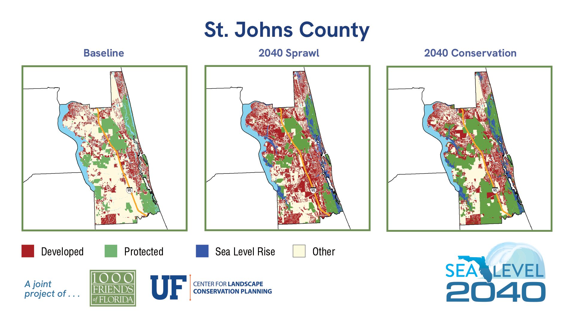| 2019 | % of Total Acreage | Sprawl 2040 | % of Total Acreage | Conservation 2040 | % of Total Acreage | |